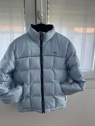 Anorak/chaqueta de invierno color azul claro con capucha y cierre de cremallera. Su tejido principal es nylon y el forro es de poliéster, así que estaremos bien abrigados con el.