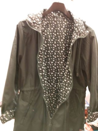 Abrigo tipo impermeable, estupendo para la lluvia; Repelente del agua; muy muy calentito porque tiene un forro de tela muy bonita de cuadros y pelito. La capucha puede ir montada o abierta, y queda preciosa