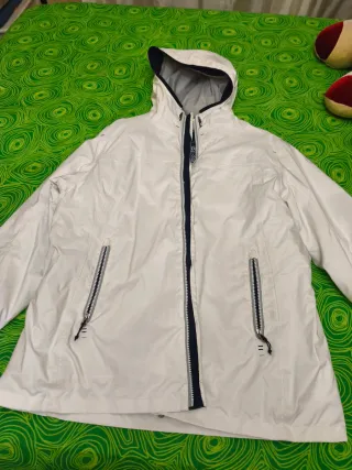 Chubasquero fino talla S. Color azul claro con 2 rayas de adorno en los hombros en blanco y azul marino. 2 bolsillos con cremallera. Capucha recogida en el cuello. Goma en los puños. Muy ligero y práctico.