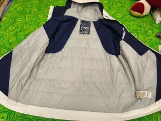 Cortavientos con diseño moderno y detalles reflectantes. - Paneles de color azul, blanco y gris. - Mangas y laterales en negro. - Cremallera frontal. - Puños y bajo ajustables. reflectante desgastado