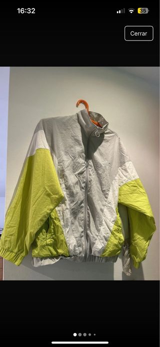 Cortavientos de la marca Pull & Bear con un diseño moderno y llamativo. - Combinación de colores gris y verde lima. - Cremallera frontal. - Puños y cintura elásticos. - Sirve para talla S y M también