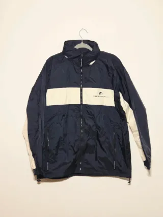 Chaqueta técnica cortavientos de corte recto y diseño minimalista, ideal para un look "clean" o urbano muy elegante, azul oscuro. Estado: Impecable, como nueva. Material: Exterior de 100% poliamida técnica (resistente y ligera) y forro interior de 100% poliéster. Detalles técnicos Cremallera central termosellada para mayor protección contra el viento. Bolsillos laterales con cremallera oculta. Con capucha. Puños ajustables con botones de presión metálicos. Cintura ajustable mediante cordones elásticos y tancas en contraste azul. Talla: XL