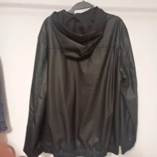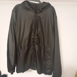 Chaqueta de Lefties. Exterior de poliuretano (como cuero, impermeable), con cremallera y capucha ajustable, bolsillos con botones, color negro, talla L. Queda ajustada en la cintura, dando apariencia de chubasquero pero más grueso.