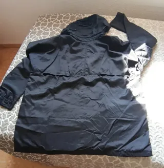 Impermeable azul marino talla XL (da mucha talla). Con cremallera y automáticos, capucha escondida en el cuello. Poco usado.