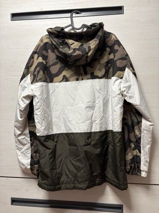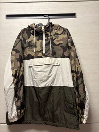Chaqueta tipo chubasquero con diseño camuflaje y bloques de color. - Diseño de media cremallera. - Capucha con cordones ajustables. - Bolsillo frontal tipo canguro. - Puños elásticos.