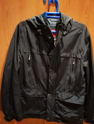 Chaqueta impermeable con un forro interior de polar para mayor calidez. - Diseño con capucha. - Cierre de cremallera frontal. - Bolsillos laterales con cremallera. - Tiene una mancha en el forro interior que no se ve cuando la llevas puesta, en la última foto.