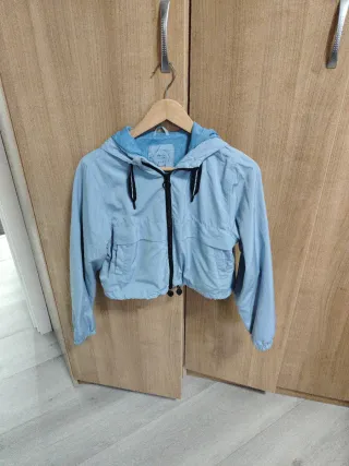 Chaqueta fina estilo chubasquero, corta y con capucha. - Cierre de cremallera. - Cordones ajustables en la capucha y el bajo. - Bolsillos frontales con solapa. Talla XS como nueva Es la tela estilo chubasquero pero cala.. chaqueta de primavera