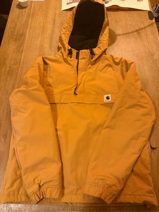 Chubasquero Carhartt de color azul marino. - Diseño tipo anorak. - Capucha ajustable. - Bolsillo canguro delantero. - Cierre de cremallera parcial en el cuello. - Descuento por compra de otro articulo Prefiero venta en mano