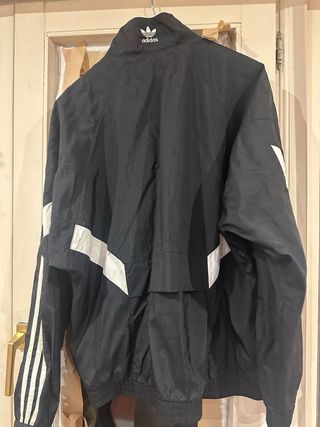 Chubasquero deportivo Adidas en color negro. Presenta un diseño moderno con detalles blancos en las mangas y el cuerpo. - Cierre de cremallera frontal. - Puños y cintura elásticos. - Logo de Adidas en el pecho. preguntar por medidas