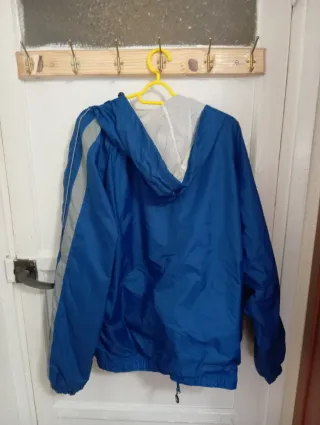 Chubasquero azul . Talla 14-15 Sirve como cortavientos, ventilacion e la espalda, forro de rejilla, la capucha se puede recoger y cierre con velcro de los bolsillos.
