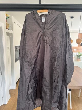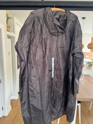Chubasquero ligero con mangas, ideal para protegerse de la lluvia. Está perfecto. Está arrugado porque se guarda enrollado y hasta que no lo pones con agua no se estira - Diseño con capucha. - Cierre de cremallera parcial. - Bolsillos para meter la mano para acceder al bolsillo del pantalón. No es un bolsillo al uso