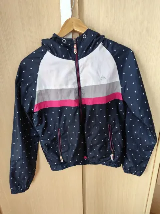 Cortavientos con capucha en color azul marino, decorado con un divertido estampado de estrellas blancas. Presenta detalles en color blanco, gris y rosa. - Capucha integrada. - Cierre de cremallera frontal. - Bolsillos laterales con cremallera. Es talla S aunque talla como una M. Los agarres de las cremalleras están un poco amarillentas por el uso, en las mangas pequeñas marcas de oxido que prácticamente no se notan.