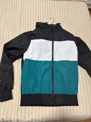 Corta vientos con un par de usos. Con capucha que puede guardarse en el cuello de la chaqueta, 2 bolsillos. Prácticamente nuevo como puede observarse. Es como para un chic@ de 12_13 años.