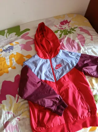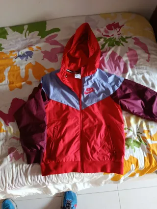 Chaqueta cortavientos Nike para niño, con un diseño moderno y deportivo. - Mangas en color morado. - Cuerpo principal en rojo vibrante. - Paneles laterales en gris claro. - Capucha integrada. - Cierre de cremallera frontal.