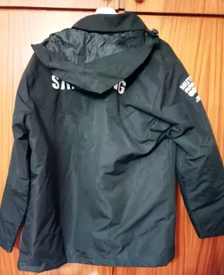 Chaqueta impermeable de color negro. - Diseño con capucha. - Detalle de texto en la espalda y manga (Samsung, mutua Madrid) - 2 bolsillos internos y 2 externos