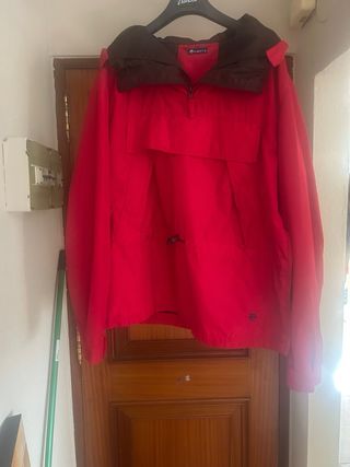 Cortavientos de estilo deportivo con capucha. - Color principal rojo. - Detalle de capucha en color marrón. - Bolsillo frontal tipo canguro. - Cordón ajustable en la cintura.