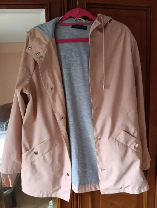 Chaqueta corta impermeable con capucha. - Diseño moderno con bolsillos frontales. - Cordones ajustables en la cintura y capucha. - Cremallera frontal. - Mangas largas con puños elásticos. - Tiene algún desperfecto en los cordones frontales (he adjuntado foto)