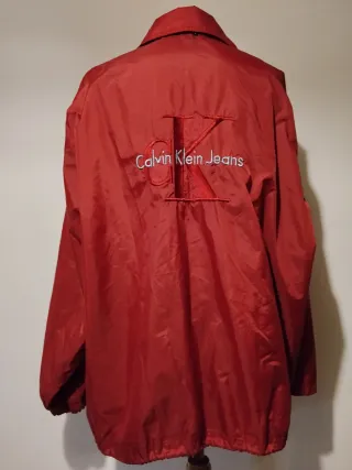 Chubasquero vintage años 90 de Calvin Klein Jeans en color rojo. Comprado en Nueva York. Un clásico de esta marca, ideal para lluvia. Muy ligero, con bolsillos laterales e interior. - Diseño con logo bordado en la espalda. - Estilo informal y moderno.