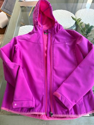 Chaqueta impermeable de color rosa con capucha y forro interior gris. - Cierre de botones a presión. - Dos bolsillos delanteros con solapa. - Cordón ajustable en la capucha.