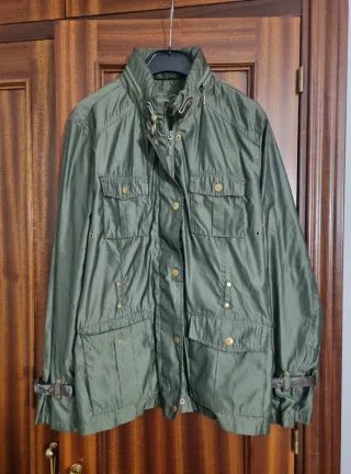Cortavientos de la marca Lloyd's en color verde. Un diseño práctico y con estilo. - Cierre de cremallera frontal. - Cuatro bolsillos delanteros con solapa y botón. - Puños ajustables con hebilla de cuero. Algo cuarteada y se puede sustituir. - Cuello alto con detalle de cordón. Muy chula. La vendo porque me queda grande.
