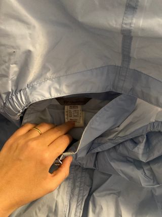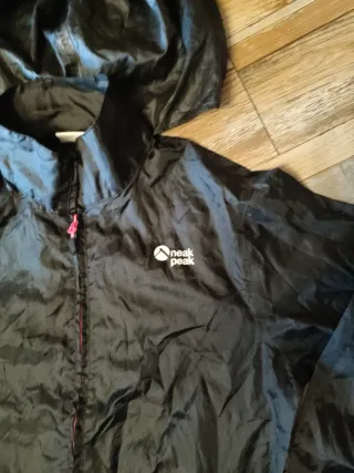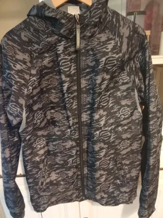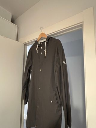 Chubasquero impermeable, capucha desmontable, puños elásticos,posee dos bolsillos externos y uno en el interior. Es algo abrigado, ideal para días templados. Está en buen estado general,tiene algún detalle, pero ningun roto ni descosido