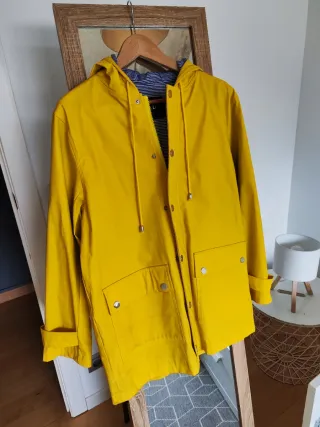 Chubasquero premamá de la marca C&A en color amarillo. Diseñado para ofrecer comodidad durante el embarazo y con una cubierta adicional para el bebé. - Talla M (38 / 10). - Capucha ajustable con cordón. - Cierre de cremallera y botones a presión. - Dos bolsillos frontales con solapa y botón. - Forro interior de color azul marino.