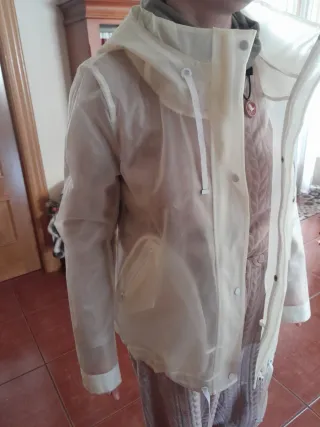 Chubasquero ligero y moderno. - Diseño transparente. - Capucha con cordón ajustable. - Cierre de botones a presión. - Bolsillos frontales con solapa.