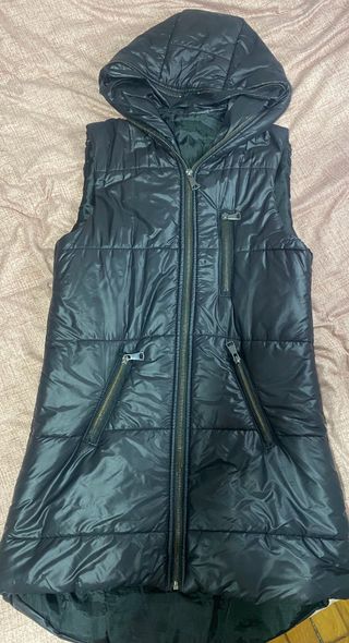 Chaleco largo con capucha, estilo chubasquero. - Cierre de cremallera frontal. - Dos bolsillos laterales con cremallera. - Bolsillo superior en el pecho con cremallera.