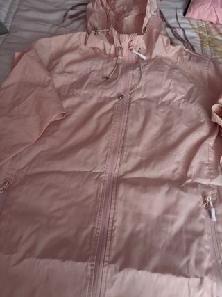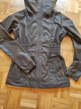 Chubasquero mujer, talla M, ligero con un diseño moderno y práctico. Ideal para protegerte de la lluvia. - Cierre cremallera y de botones a presión. - Capucha ajustable con cordón. - Bolsillos laterales y bolsillos interior. - Forro interior a rayas. Esta en muy buen estado, limpio y sin ninguna tara. Protege muy bien de la lluvia y humedad ☔
