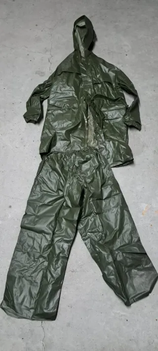 Conjunto de traje de agua de dos piezas. - Chaqueta con capucha. - Pantalones. - Material impermeable.