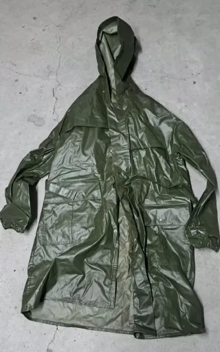 Chubasquero de color verde caqui con cuello alto y cierre de botones. Una prenda práctica, cómoda y versatil