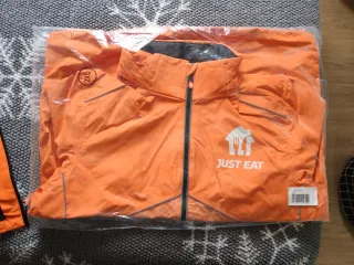 Chubasquero de la marca Just Eat. - Talla XXL. - Color naranja. - Cierre de cremallera frontal. - Detalles reflectantes en mangas y bajo.