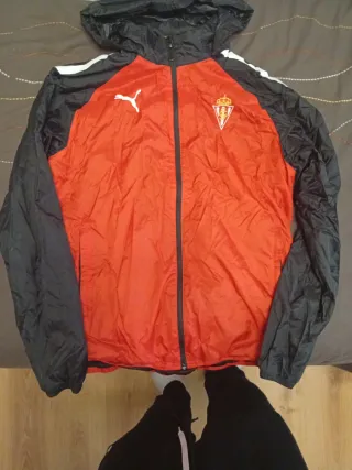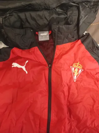 Chubasquero con capucha del Sporting de Gijón. - Diseño con paneles en rojo y negro. - Logo de Puma en blanco. - Escudo del club en el pecho.