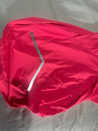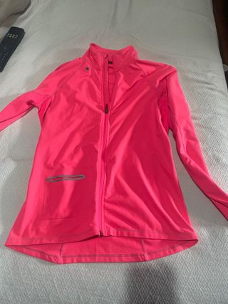 Chaqueta deportiva de color rosa. - Cremallera frontal completa. - Cuello alto. - Detalle reflectante en el pecho. - Mangas largas con puños elásticos. - Bajo curvo.