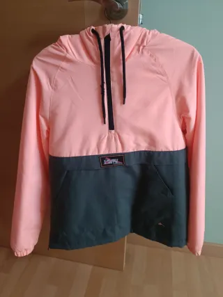 Cortavientos de la tienda Décimas con diseño moderno y juvenil. - Parte superior en color rosa. - Parte inferior en color gris oscuro. - Capucha con cordones negros. - Bolsillo canguro - Cremallera en un lateral