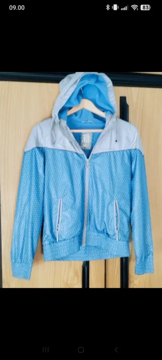 Cortavientos con un diseño moderno y juvenil, perfecto para protegerte del viento. - Diseño de lunares blancos sobre fondo azul. - Capucha integrada. - Cremallera frontal. - Bolsillos laterales con cremallera. - Puños y cintura elásticos.