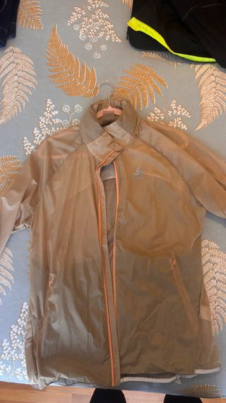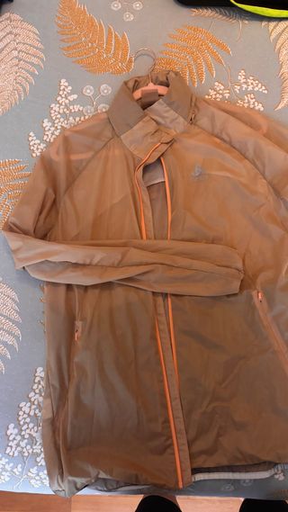 Cortavientos ligero de la marca Odlo. - Color beige con detalles en naranja. - Diseño resistente al agua. -Con capucha -Ideal running