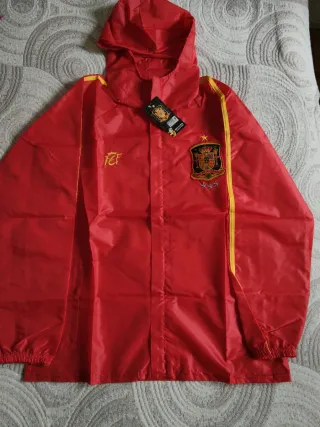 Chubasquero de la Selección Española de fútbol. - Diseño con capucha. - Detalles en amarillo. - Escudo bordado de la RFEF. Talla L, mide desde el hombro 72 cm de largo por 110 cm de ancho. A estrenar, precio fijo.