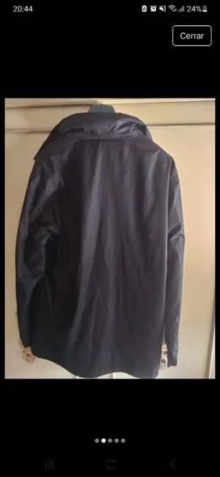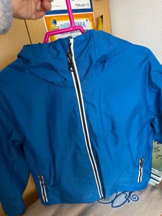 Anorak triple de color azul oscuro. - Cierre de cremallera y botones a presión. - Cuatro bolsillos frontales con solapa. - Cuello alto. - Tiene gorro que se queda guardado en el cuello. - Cuando se le quita la parte de chubasquero se queda una chaqueta tpo husky con dos bolsillos delanteros. - También se puede quedar como chaleco como se observa en las fotos. - En perfecto estado. - No hago envíos. - No tiene etiqueta porque le hemos usado una sola vez. - Ideal para el frío porque está forrado de franela