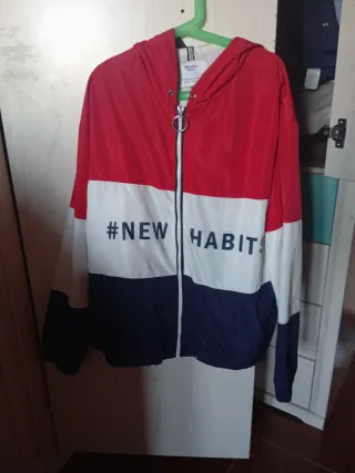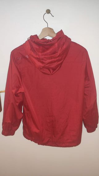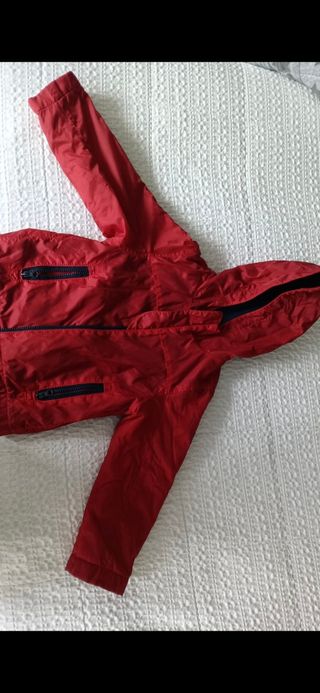 Chubasquero de color rojo con un diseño moderno y práctico.10 euros. Mira mi perfil. Todo impecable. - Cierre frontal con cremallera. - Dos bolsillos laterales con cremallera. - Puños ajustables con botón.