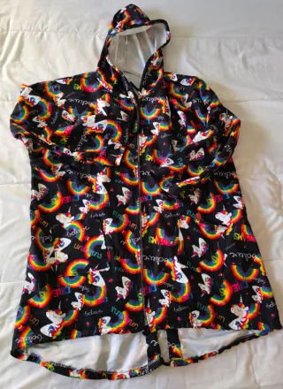 Chubasquero con un divertido estampado de unicornios y arcoíris sobre fondo negro. Es una prenda ligera y con capucha, perfecta para días lluviosos. - Diseño con unicornios y arcoíris. - Cierre de cremallera. - Capucha integrada. -68 cm entre axilas - Largo delantero 75 - Largo trasero 87 - Con 2 bolsillos