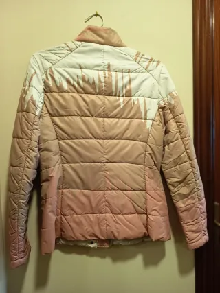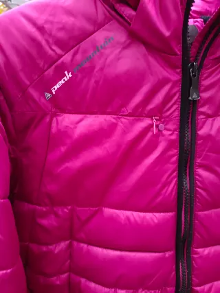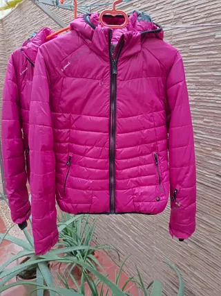 Chaqueta de montaña con un diseño acolchado y capucha. Prácticamente nueva. Usada en dos ocasiones. - Color rosa vibrante con detalles en negro. - Cremallera frontal completa. - Bolsillos laterales con cremallera. - Bolsillo en manga izquierda y en interior. - Espalda reforzada con tejido algodón, para mayor confort. - Capucha extraíble. Para 16 años. Medidas: Largo desde hombro 60 cms. Largo de manga 64 cms. Contorno pecho 98 cms.