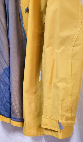 Chaqueta impermeable de la marca "TRIBORD" Decathlon, color amarillo. Ideal para actividades al aire libre y senderismo. - La talla corresponde a una talla europea 42-44 (EU) - Cierre de cremallera frontal. - Capucha ajustable. - Bolsillos laterales con cremallera. - Puños ajustables con velcro.