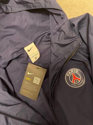 Cortavientos Nike del Paris Saint-Germain. - Diseño en color azul marino con detalles en negro. - Logo de Nike y escudo del PSG. - Capucha integrada.