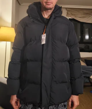 Se venden dos plumíferos impermeables de Zara, uno en color gris y otro en negro. Ambos son nuevos y vienen con etiquetas. - Diseño acolchado. - Capucha integrada.