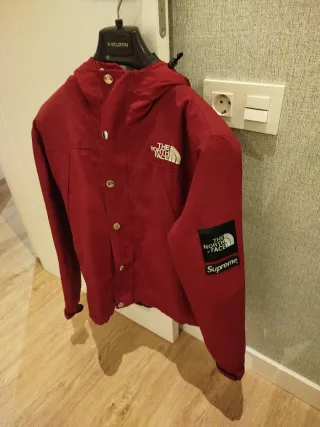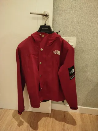 Cortavientos de la colaboración entre The North Face y Supreme. - Color rojo vibrante. - Diseño con capucha. - Logos de ambas marcas visibles.
