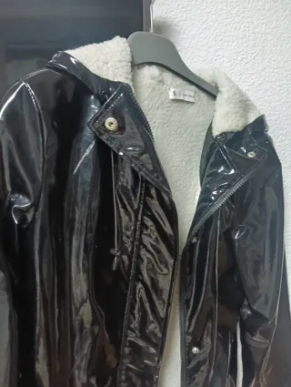 Chubasquero de mujer con un acabado brillante y forro interior de borreguito. - Cierre de cremallera y botones a presión. - Capucha. - Bolsillos laterales.