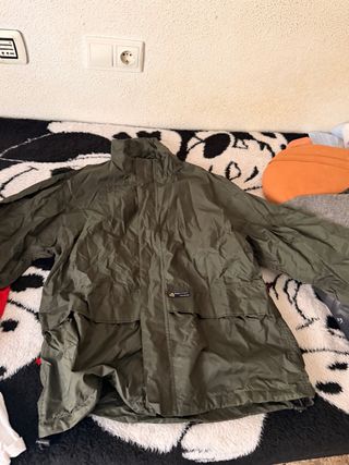 Chubasquero impermeable de color verde oliva. Ideal para protegerse de la lluvia. Dos piezas. Chaqueta y pantalón. - Material ligero y resistente. - Diseño con capucha. - Cierre de cremallera frontal. Medidas: Largo chaqueta 79 cm Manga largo 60 cm Boca manga 16 cm ×2 Pecho 65 cm ×2 Bajo 63 cm ×2 Largo pantalón 108 cm Cintura recog 30 cm ×2 Tiro 40 cm Cadera 56 cm ×2 Trasero 70 cm ×2 Bajo pantalón 25 cm ×2