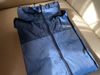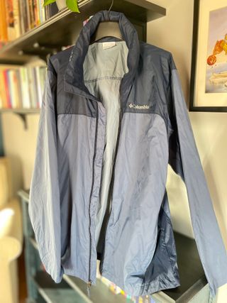 Chaqueta cortavientos de la marca Columbia en color azul. Como nueva. Es azul aunque en las fotos tenga tonos grises. La vendo porque la talla me queda demasiado grande. No es una L normal. Mirad las medidas. Tiene capucha que se puede guardar. - Diseño ligero y práctico. - Cierre de cremallera frontal.