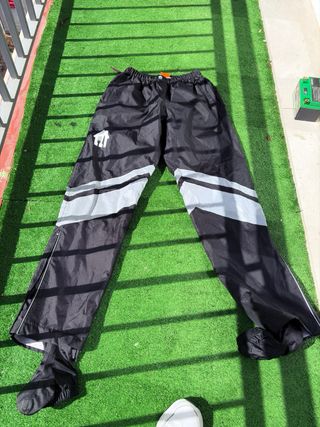 Pantalones impermeables de color negro con detalles reflectantes. - Cintura elástica. - Logo blanco de Foodora en la pierna. - Cremallera en el tobillo. - Rayas reflectantes plateadas.